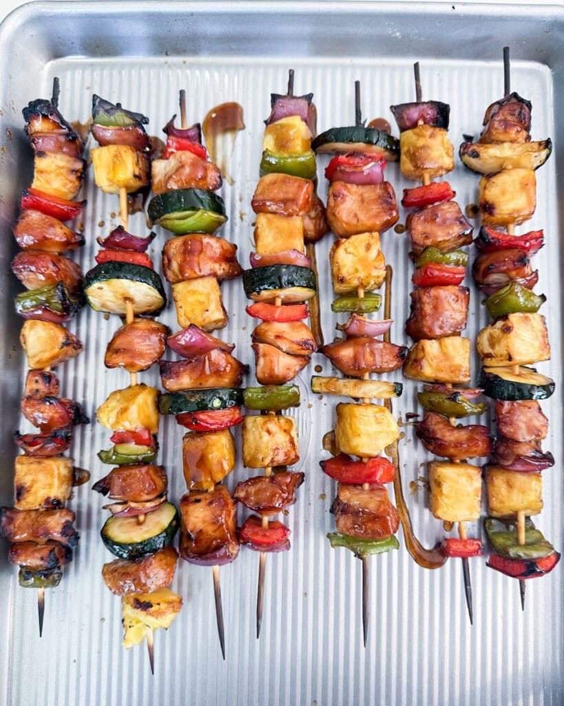 The homemade teriyaki sauce really takes these kabobs to the next level. It’s the perfect balance of sweet, and salty, and thick enough to coat every piece of chicken. Plus the combo of the chicken, peppers, onion, and pineapple all come together to make this a delicious recipe that tastes as good as a restaurant.