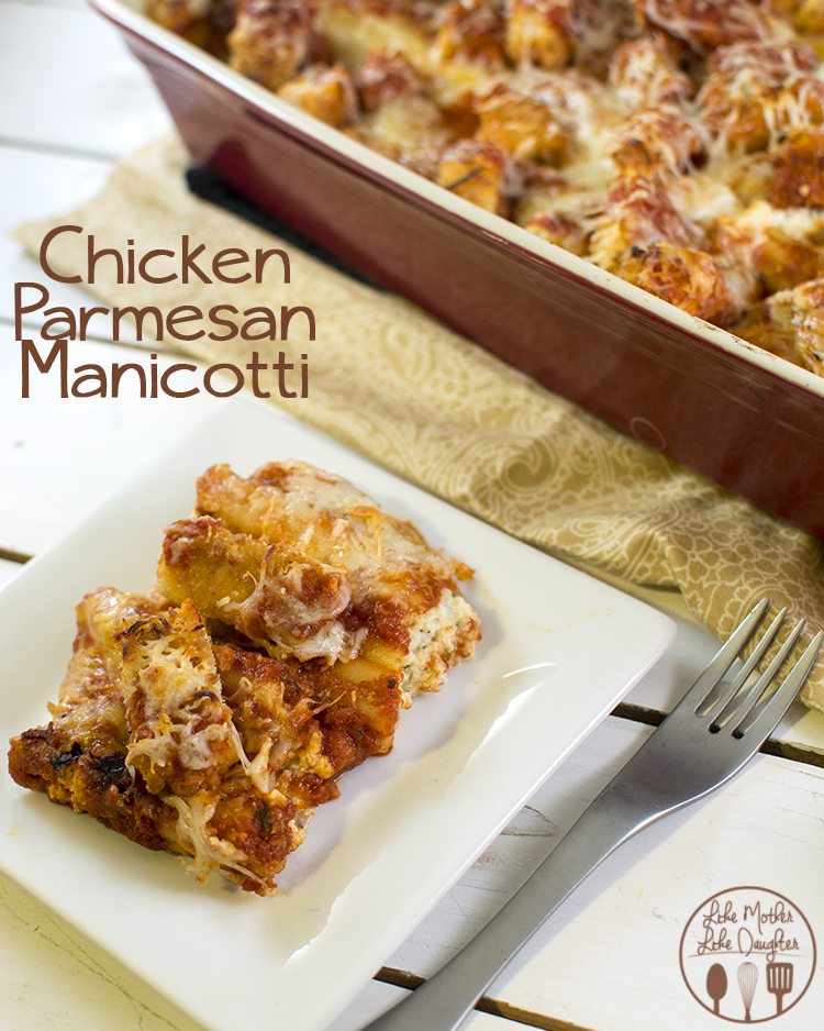 You all know how much I love chicken parmesan, right? I mean I’ve made plain chicken parmesan, chicken parmesan pizza, chicken parmesan pot pie – so when thinking of dinner I decided to make chicken parmesan manicotti. Now originally, I was going to make stuffed shells, but when you go to the store and they’re all gone because they were on sale, and you try another store and they don’t have any jumbo shells, you give up and decide to go for manicotti instead. It ended up not being a bad decision at all – this chicken parmesan manicotti was amazing!
