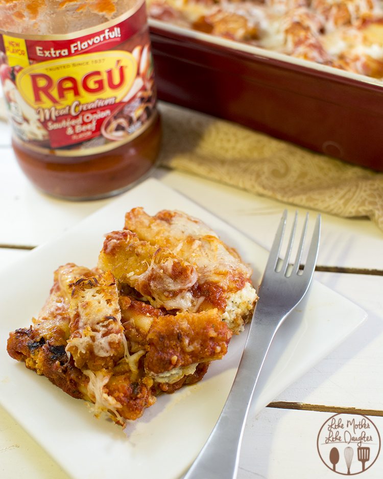 - Pour about 1 1/2 cups of your Ragú® Meat Creations Sauteed Onion & Beef sauce in the bottom of a 9x13 baking dish.