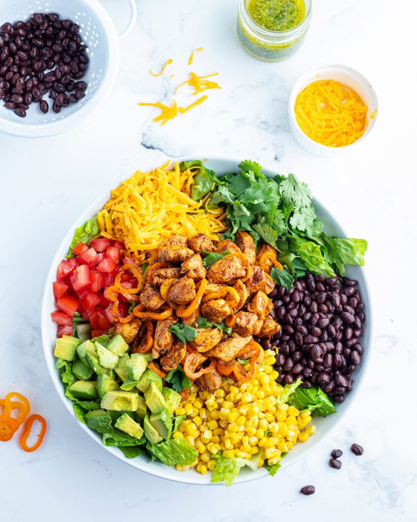 This chicken taco salad is such a tasty salad that comes together in less than 30 minutes. It’s a great healthy meal option that is perfect for meal prepping, or for feeding the whole family.