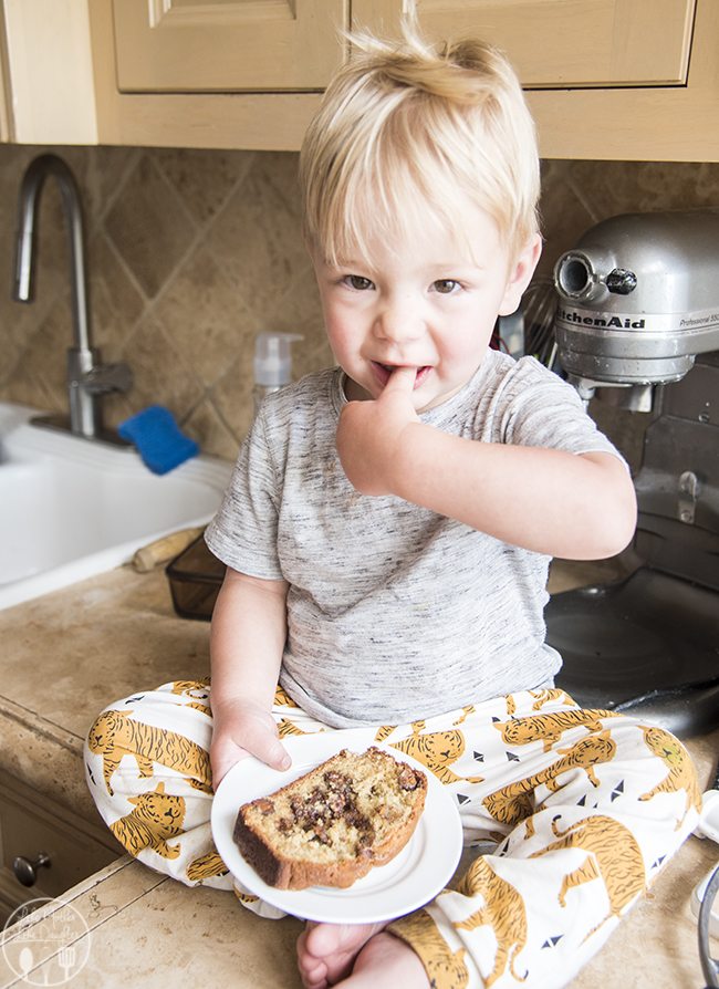 I’ve made this recipe several times and I still can’t get over that delicious smell of fresh warm banana bread wafting through the house. Nate got home from work, right as the bread was finishing baking in the oven, perfect timing to enjoy a fresh warm slice of banana bread. And our whole family loves it.