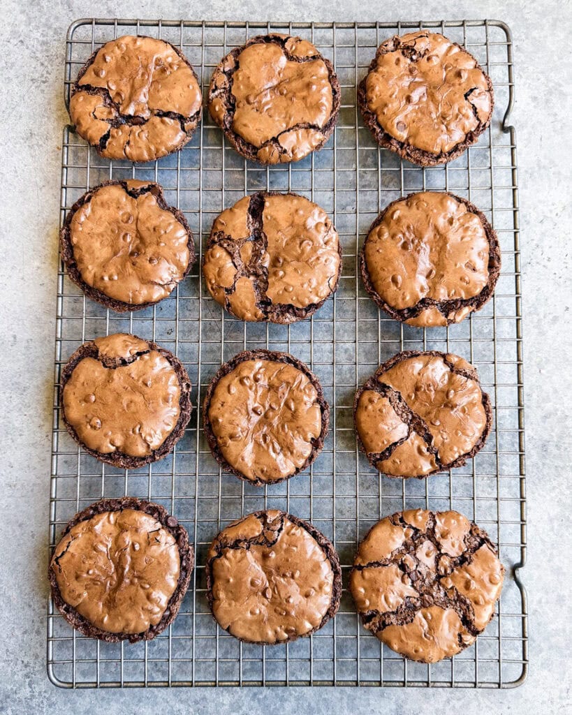 Step 4: Bake the cookies. Bake the cookies until the tops are shiny and crackled across. Let the cookies cool for 10 minutes then gently transfer them to a wire rack, or transfer the whole piece of parchment paper to the wire rack if you can’t get them to lift off.