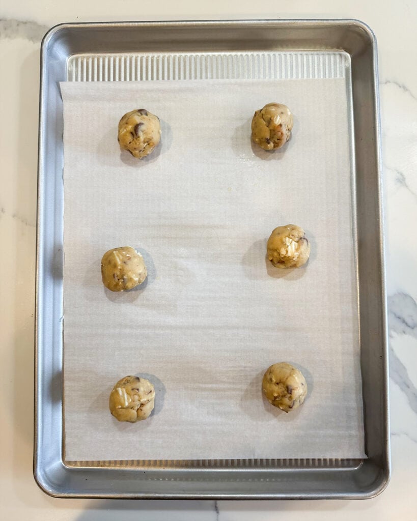 Step 4: Bake the cookies. Scoop the cookie dough into portions about 2 TBS in size. Roll them into balls and place about 6 on a baking sheet, spaced at least 3 inches apart. Bake until the tops of the cookies are just set.