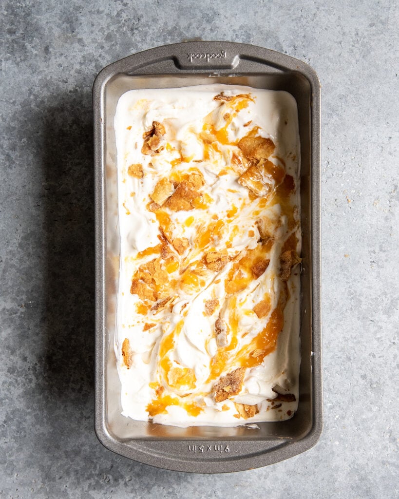 Step 4: Layer and freeze. Scoop about one third of the ice cream into a 2 QT container. Spoon peach puree over the top, and sprinkle with pie crust. Run a knife through to swirl. Repeat with another 2 layers in the same way. Cover the mixture and freeze for at least 6 hours, even better overnight.