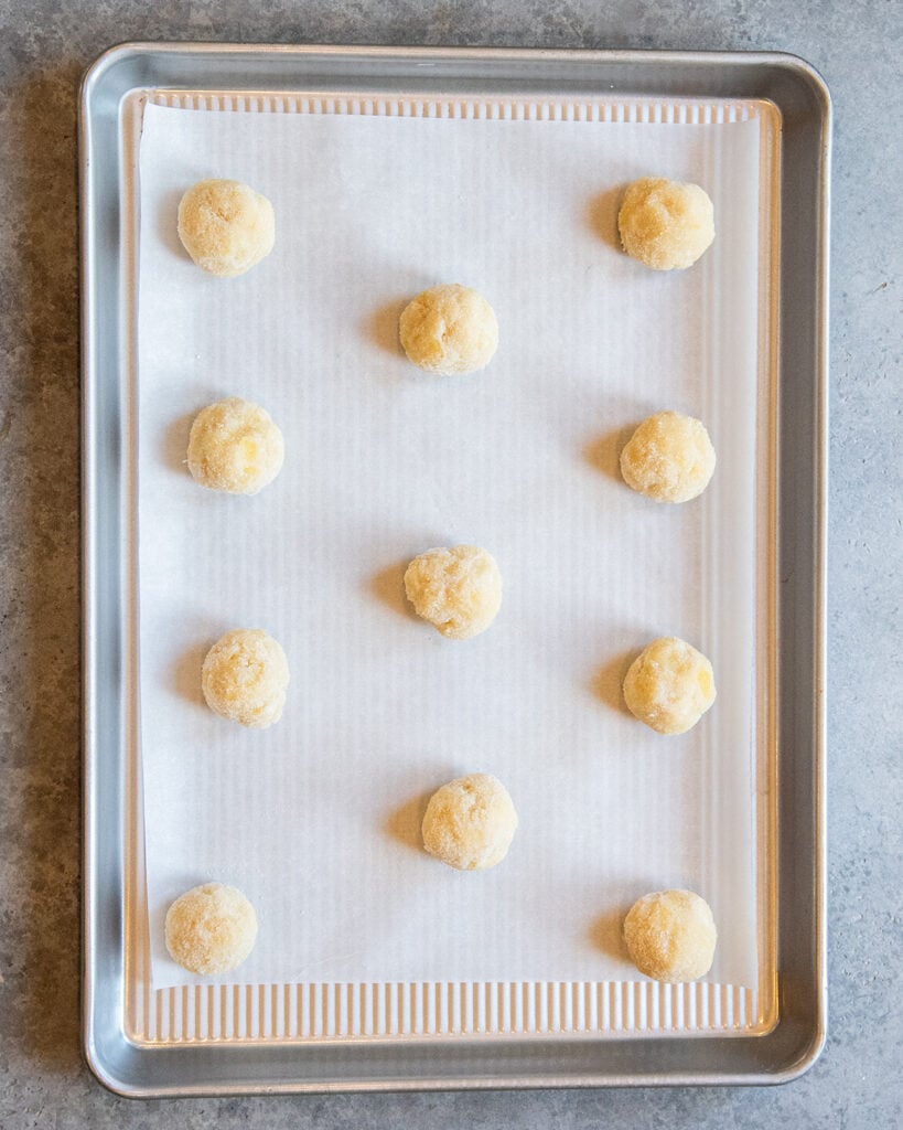 Step 3: Bake the cookies. Scoop out portions of the cookie dough, about 1 to 1.5 TBS in size. Roll each ball into granulated sugar. Place them onto a parchment paper lined baking sheet, about 3 inches apart, and bake until the tops puff up and the bottoms are lightly golden. Let the cookies cool.