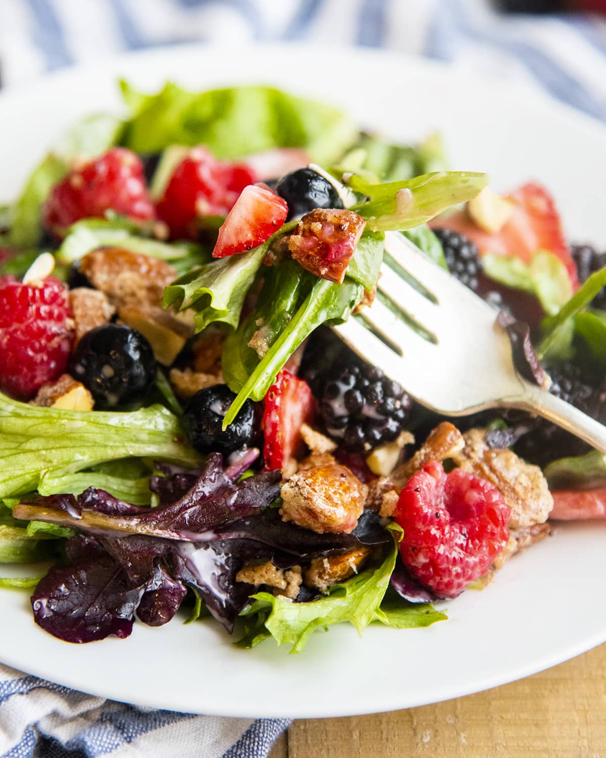 This delicious summer berry salad is the perfect combination of mixed greens, fresh berries, candied nuts, and poppy seed dressing. You’ll want to eat it all spring and summer long.
